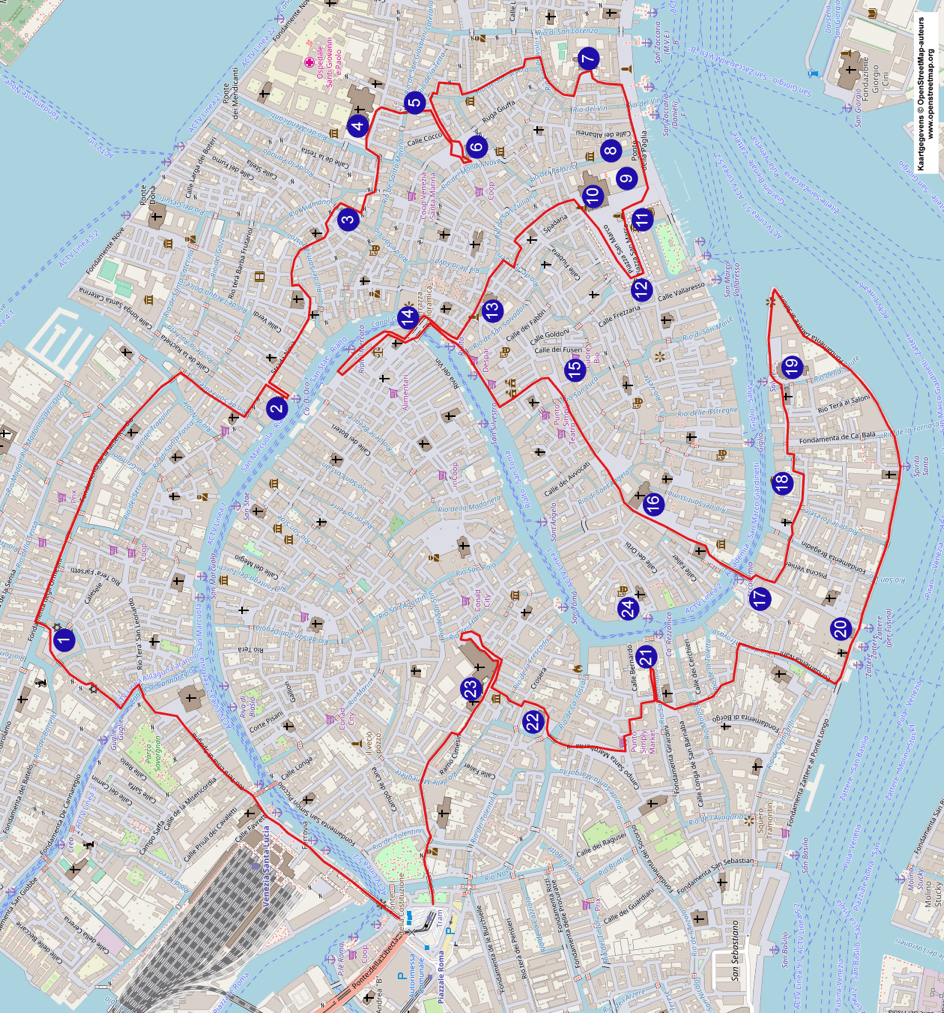 Met de trein: Bij het verlaten van het treinstation Venezia Santa Lucia ga je naar links. Je bevindt je dan direct op de eerste meters van onze Venetie wandelroute en kunt de beschrijving meteen volgen.